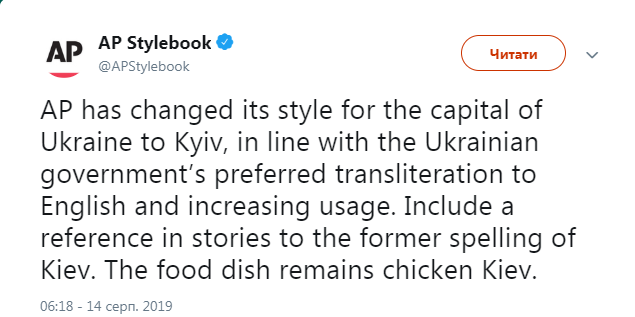 "AP изменило правописание столице Украины на Kyiv в соответствии с предпочтениями украинского правительства в транслитерации этого названия на английский и в связи с ростом использования", - заявили в АР.