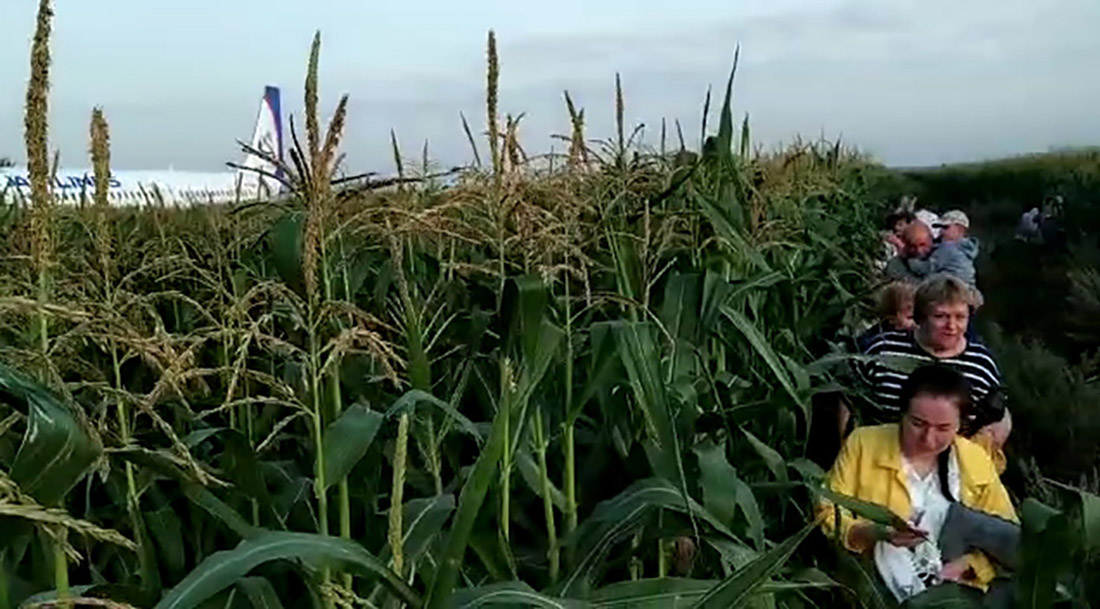 В сети позже обнародовали видео пассажиров. На них видно, как при взлете рядом с иллюминаторами пролетела стая птиц, а также, как пассажиры идут по кукурузному полю после аварийного приземления.
