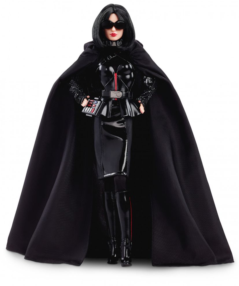На черноволосую куклу в образе Дарта Вейдера надели черное облегающее платье из кожи и объемный кейп. Дополнен образ клатчем со стразами и шипованным ошейником.