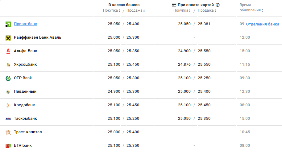 В банках курс доллара с утра был такой: средняя покупка 25,05 грн, средняя продажа 25,40 грн. В обед американская валюта ненамного подорожала: 25,10 грн - покупка и 25,40 грн - продажа. К вечеру средний курс составил 25,10 грн в покупке и 25,35 грн в продаже. В разных банках курс немного отличался в течение всего дня.