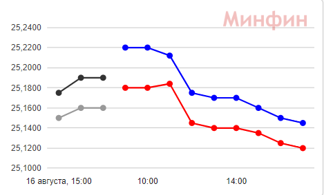19 августа НБУ установил официальный курс доллара понизил курс доллара на 18 копеек - до 25,14 грн. В обменках доллар не менялся целый день: покупка в районе 25,24 грн, продажа - 25,28 грн. Межбанк закрылся с котировками 25,12 грн - покупка и 25,14 грн - продажа. В банках доллар в среднем покупали за 25,10 грн и продавали за 25,35 грн.