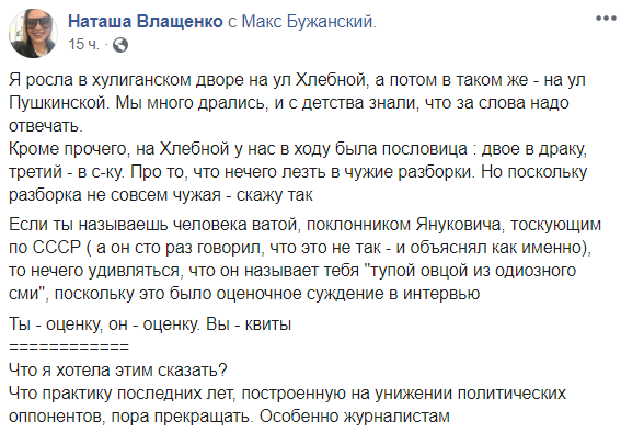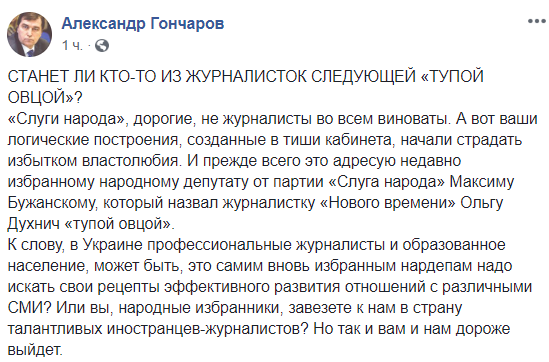 "Слуги народа", дорогие, не журналисты во всем виноваты. А вот ваши логические построения, созданные в тиши кабинета, начали страдать избытком властолюбия. И прежде всего это адресую недавно избранному народному депутату от партии "Слуга народа" Максиму Бужанскому, который назвал журналистку "Нового времени" Ольгу Духнич "тупой овцой". К слову, в Украине профессиональные журналисты и образованное население, может быть, это самим вновь избранным нардепам надо искать свои рецепты эффективного развития отношений с различными СМИ? Или вы, народные избранники, завезете к нам в страну талантливых иностранцев-журналистов? Но так и вам и нам дороже выйдет".