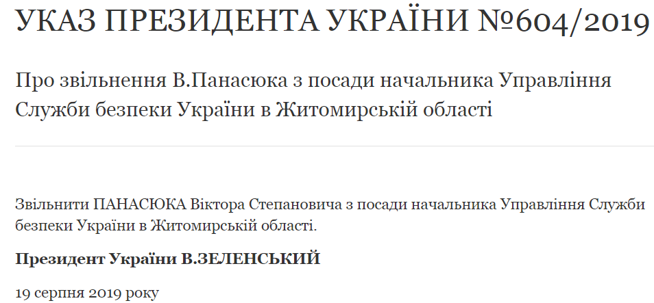 "Уволить Панасюка Виктора Степановича с должности начальника управления Службы безопасности Украины в Житомирской области. Назначить Головаша Олега Олеговича начальником Управления Службы безопасности Украины в Житомирской области", - говорится в документах.