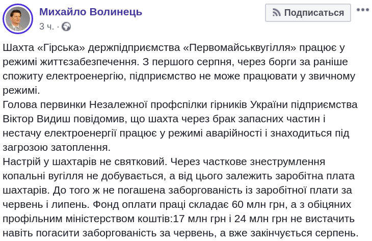 "Шахта "Горная" госпредприятия "Первомайскуголь" работает в режиме жизнеобеспечения. С 1 августа из-за долгов за ранее потреблённую электроэнергию предприятие не может работать в обычном режиме… Шахта из-за нехватки запасных частей и нехватки электроэнергии работает в режиме аварийности и находится под угрозой затопления", - указал он.