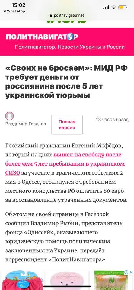 "Уважаемая Мария, когда вы говорите о том, что требования денег представителями Генерального консульства РФ от Евгения Мефедова - это фейк, и что ему оформлены необходимые документы, и что представители консульства оказывают ему какую-то помощь, вы, проверяйте пожалуйста эту информацию... Я уверяю вас Мария, что представители Генконсульства РФ в Одессе не сделали ровным счетом ничего для того, чтобы Мефедов как можно скорее попал на свободу. Эти люди позволили себе отказать ему в выдаче необходимых документов, оформлении паспорта, и отказывали ему в предоставлении хотя бы минимальной моральной поддержке" - заявил адвокат.