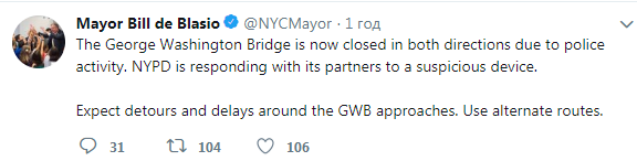Об этом сообщил на своей странице в Twitter мэр Нью-Йорка Билл де Блазио.