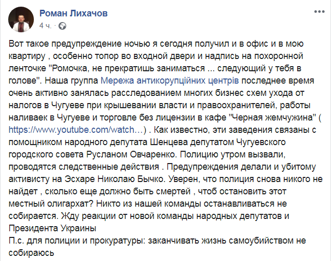 "Вот такое предупреждение ночью я сегодня получил и в офис и в мою квартиру , особенно топор во входной двери и надпись на похоронной ленточке "Ромочка, не прекратишь заниматься... следующий у тебя в голове", - сообщил Лихачев.