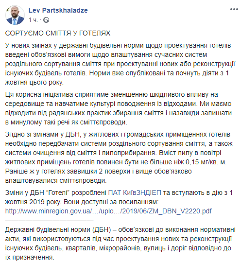 Обязательные требования по устройству современных систем раздельной сортировки мусора при проектировании новых или реконструкции существующих зданий гостиниц содержатся в новых изменениях в государственные строительные нормы. Об этом сообщил заместитель министра регионального развития, строительства и жилищно-коммунального хозяйства Украины Лев Парцхаладзе на своей странице в Facebook.
