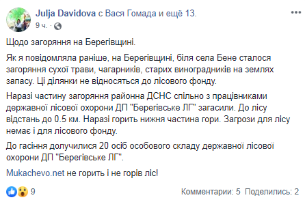 Пользователь Facebook Василина Русин сообщила, что у села Бене Береговского района горит лес и опубликовала снимки. Однако пресс-секретарь Закарпатского облуправления лесного хозяйства Юлия Давыдова заявила, что горит не лес, а кустарники и виноградники.
