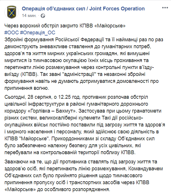 По словам представителей штаба ООС, 28 августа в 12:25 противник начал обстрел гражданской инфраструктуры в районе гуманитарного дорожного коридора "Горловка - Бахмут". При этом он применил гранатометы разных систем и крупнокалиберные пулеметы.