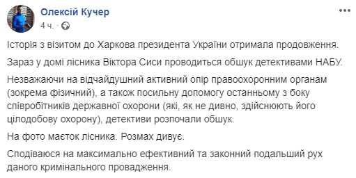 "История с визитом в Харьков президента Украины получила продолжение. Сейчас в доме лесника Виктора Сысы проводится обыск детективами НАБУ. Несмотря на отчаянное активное сопротивление правоохранительным органам, а также посильную помощь со стороны сотрудников государственной охраны (которые, как не удивительно, осуществляют его круглосуточную охрану), детективы начали обыск", - написал Кучер, который до того, как был избран нардепом, работал адвокатом.