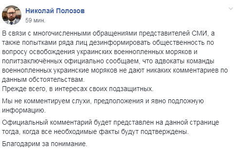 "В связи с многочисленными обращениями представителей СМИ, а также попытками ряда лиц дезинформировать общественность по вопросу освобождения украинских военнопленных моряков и политзаключённых официально сообщаем, что адвокаты команды военнопленных украинских моряков не дают никаких комментариев по данным обстоятельствам. Прежде всего, в интересах своих подзащитных", - говорится в опубликованном сообщении.