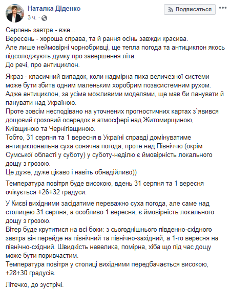 В ближайшие выходные, 31 августа и 1 сентября, в Украине будет господствовать сухая солнечная погода, но в Житомирской, Киевской и Черниговской областях возможны дожди. Об этом в Facebook сообщила синоптик Наталья Диденко.