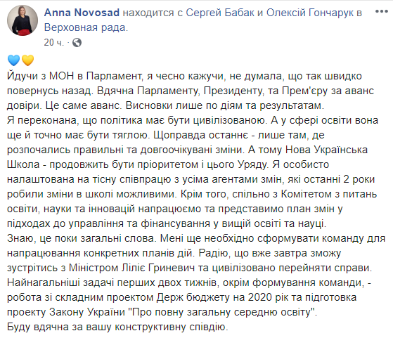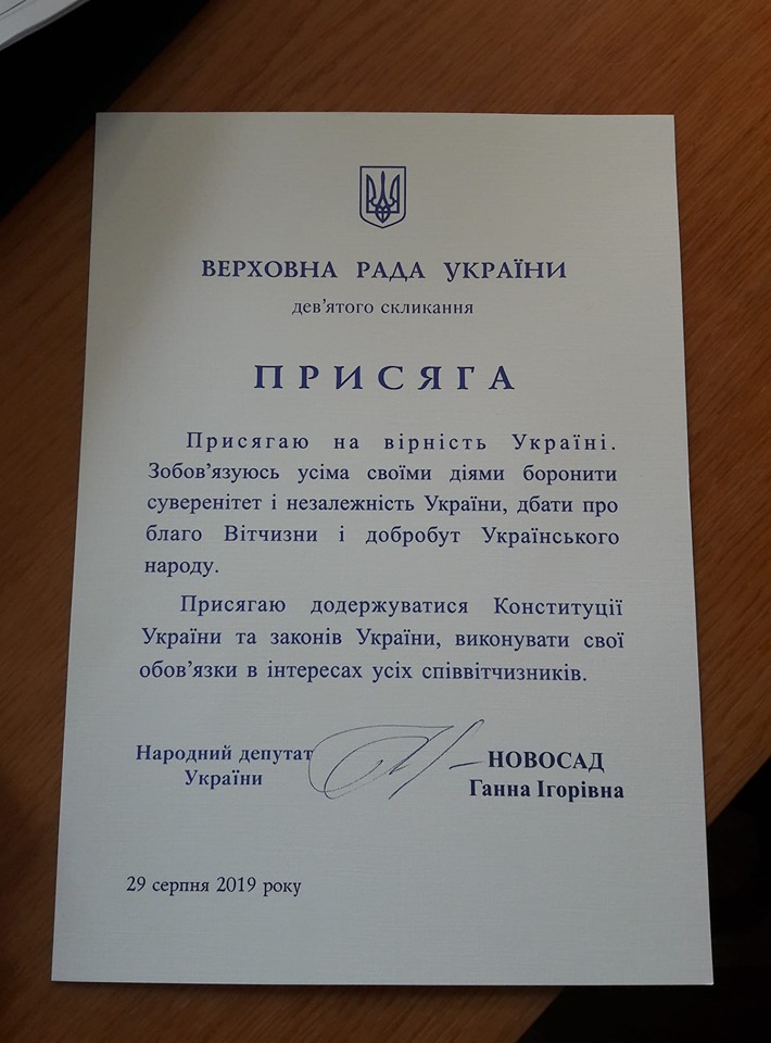 Новосад также обнародовала фото с подписанной присягой нардепа у себя в Facebook. И перед тем, как отказаться от мандата в пользу министерского кресла успела написать, насколько для нее это "большая честь и осознание чрезвычайной ответственности".