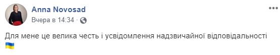 Получив высокую должность в Кабмине, Новосад поблагодарила коллег за аванс доверия. "Это именно аванс. Выводы только по действиям и результатам. Я убеждена, что политика должна быть цивилизованной", - написала Новосад в Facebook.