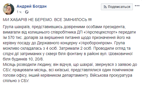 "Месяц разводили человека, он почувствовал, что мошенники, обратился с заявлением в СБУ, работали месяц, все киевские, представлялись один помощником председателя офиса, другой руководителем департамента. Военная прокуратура совместно с СБУ", - написал глава ОП.