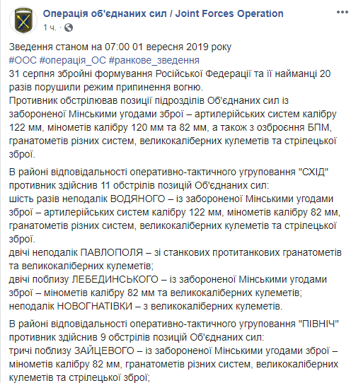 За прошедшие сутки, 31 августа, боевики на Донбассе провели 20 обстрелов позиций ВСУ. Об этом в Facebook сообщает пресс-центр операции Объединенных сил.