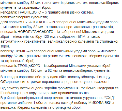 Противник применял, как заявляет пресс-центр, запрещенные минскими соглашениями артиллерийские системы калибра 122 мм, минометов калибра 120 мм и 82 мм. Также применялось вооружение БПМ, гранатометы различных систем, крупнокалиберные пулеметы и стрелковое оружие. Один украинский военный был ранен.