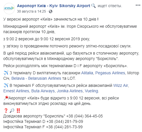 "Международный аэропорт "Киев" им. Игоря Сикорского не будет обслуживать пассажиров в течение 10 дней, с 9:00 2 сентября до 9:00 12 сентября 2019 года в связи с проведением текущего ремонта взлетно-посадочной полосы. В этот период рейсы авиакомпаний, базирующихся в столичном аэропорту, будут обслуживаться в Международном аэропорту "Борисполь", - говорится в сообщении.