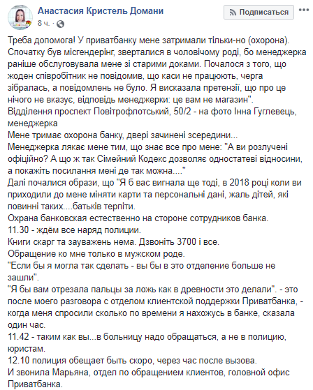 Инцидент произошел в отделении на Воздухофлотском проспекте. Анастасия-Кристель Домани сделала замечание сотрудникам банка из-за того, что в учреждении не работала касса, а объявления об этом не было. По словам девушки, менеджер, которая ее обслуживала, начала ее оскорблять, угрожать раскрыть ее личные данные, а также обращаться к ней в мужском роде.