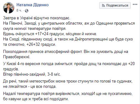В среду, 4 сентября, в Украине ощутимо похолодает, жара задержится только на востоке и юго-востоке страны. Об этом в Facebook сообщила синоптик Наталья Диденко.