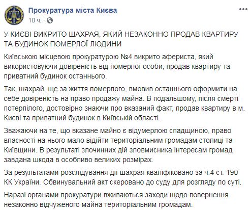 В Киеве мошенник продал квартиру, а в области - дом умершего мужчины. Об этом сообщает пресс-служба столичной прокуратуры в Facebook.