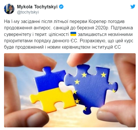 "На первом заседании после летнего перерыва Coreper согласовал продление антироссийских санкций до марта 2020 года. Поддержка суверенитета и территориальной целостности Украины остаются неизменными приоритетами повестки дня ЕС. Рассчитываю, что этот курс будет продолжен и новым руководством институтов ЕС", - говорится в опубликованном сообщении.