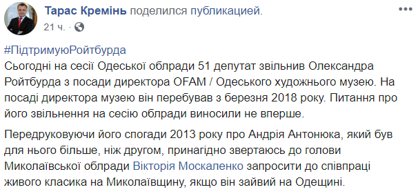 В Facebook нового уполномоченного - поддержка уволенного вчера директора одесского худмузея Александра Ройтбурда, который аплодировал убийствам в Одессе 2 мая 2014 года.
