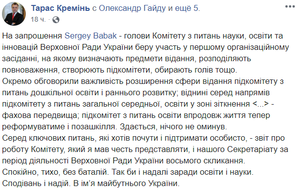 Судя по тексту поста Тараса Креминя - он собирается и дальше реформировать украинское образование. Несмотря на то, что все политические проекты, в которых он этим занимался, потерпели сокрушительное поражение.