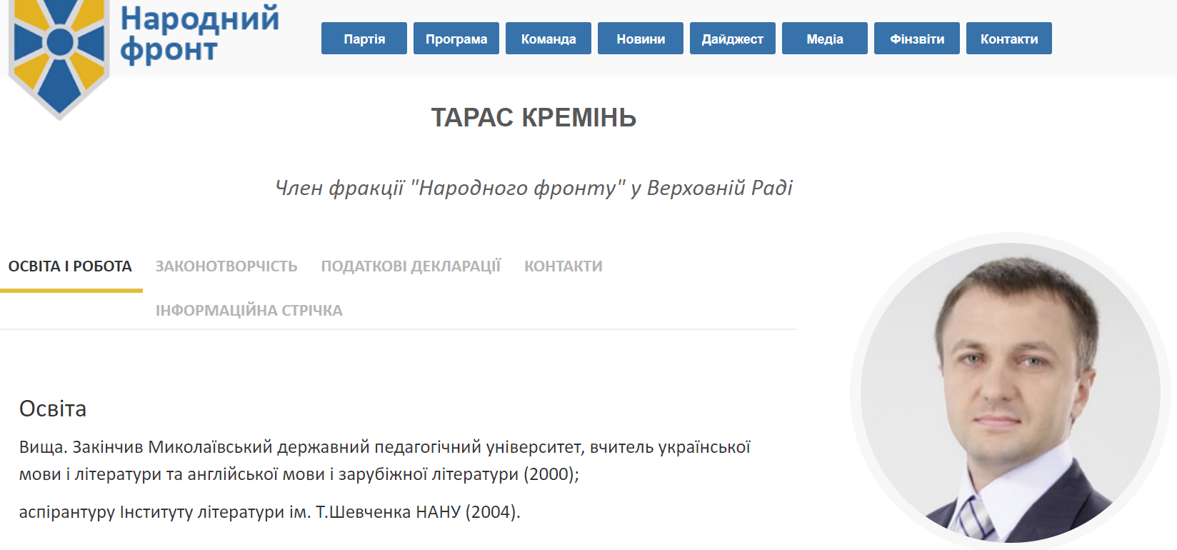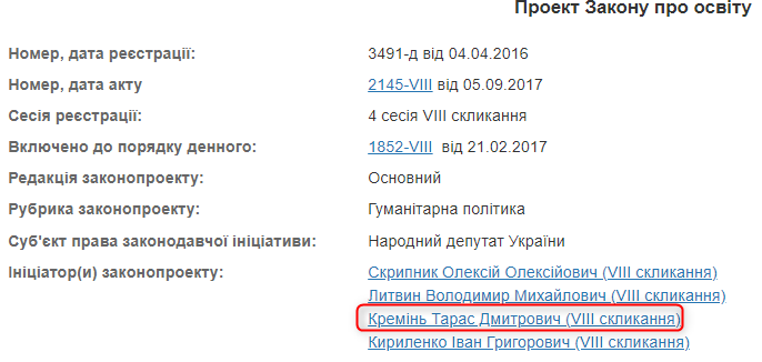 В Раде Тарас Креминь работал в комитете образования и науки. Там он занимался вопросами образования переселенцев и жителей подконтрольного Донбасса. Отметим, что именно на этот период приходится тотальная украинизация местных школ.