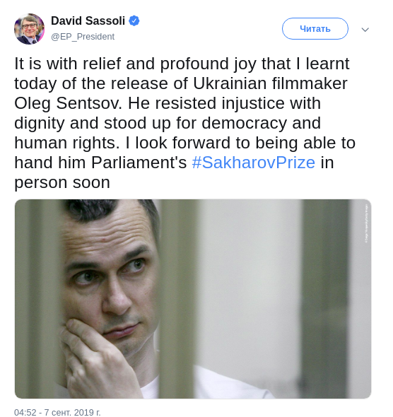 22.19 Президент Европейского парламента Давид-Мария Сассоли сообщил о том, что рад освобождению украинского режиссера Олега Сенцова. Сассоли так же ждет возможности лично вручить режисеру премию Сахарова. Об этом президент Европейского парламента написал на своей странице в Twitter.