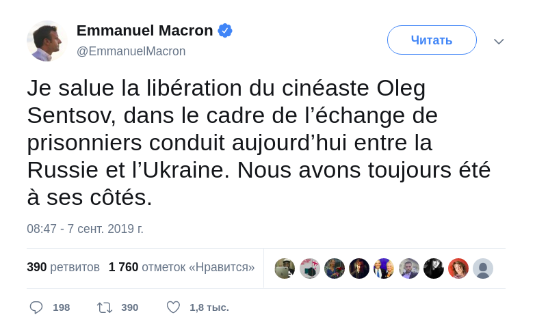 "Я приветствую освобождение режиссера Олега Сенцова в рамках обмена пленными, проводимого сегодня между Россией и Украиной. Мы всегда были на его стороне", -  заявил французский лидер.