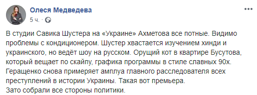 "В студии Савика Шустера на «Украине» Ахметова все потные. Видимо проблемы с кондиционером. Шустер хвастается изучением хинди и украинского, но ведёт шоу на русском. Орущий кот в квартире Бусутова, который вещает по скайпу, графика программы в стиле славных 90х. Геращенко снова примеряет амплуа главного расследователя всех преступлений в истории Украины. Такая вот премьера. Зато собрали все стороны политики".
