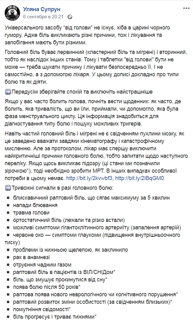 Ульяна Супрун даже после ухода с поста министра здравоохранения страны, продолжает просвещать украинцев по поводу разных медицинских проблем. Так, новый пост на Facebook американка посвятила головной боли.