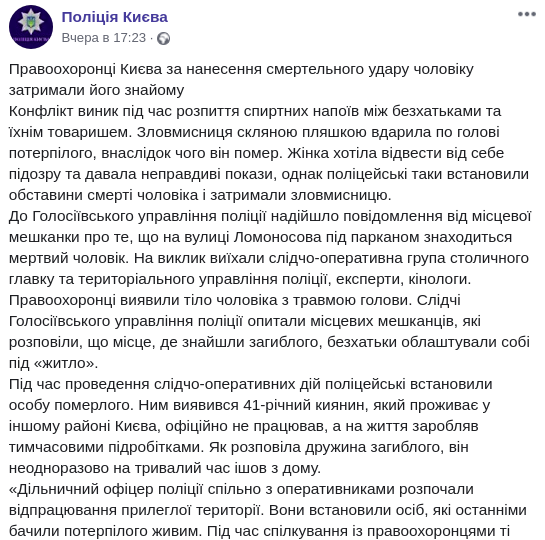 Следователи выяснили, что, выпивая, знакомые поссорились и во время словесного конфликта 31-летняя женщина ударила 41-летнего киевлянина стеклянной бутылкой по голове, в результате чего он умер.