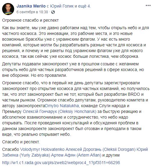 "В первый же день депутаты зарегистрировали законопроект про открытие космоса для частных компаний, но получилось так, что этот законопроект был не тот, который был разработан BRDO и частным рынком. Огромное спасибо депутатам, руководителю комитета и автору законопроекта Дмитрию Наталухе, команде "Слуги народа" и премьеру Алексею Гончаруку за быструю реакцию, абсолютное взаимопонимание и сотрудничество относительно того, что небо надо открывать. После проведения консультаций и обсуждения проблем в данном законопроекте законопроект был отозван и переподан в таком виде, который реально открывает небо", - написала она.