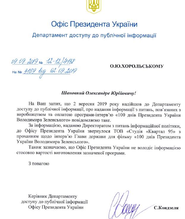 "По информации, предоставленной Директоратом по вопросам информационной политики, в Офис президента Украины обратилось ООО "Студия "Квартал 95" с просьбой об интервью Главы государства для фильма "100 дней Президента Украины Владимира Зеленского". Также отмечаем, что Офис президента Украины не владеет информацией относительно стоимости изготовления указанной программы", - сказано в сообщении.