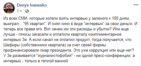 "Из всех СМИ, которые хотели взять интервью у зеленого к 100 дням, выиграл... "95 квартал". И снял кино в виде "интервью" за свои деньги. И теперь все права его. Вот зачем им эти расходы и убытки? Или еще лучше - плюсы заказали и оплатили кварталу комплиментарное интервью Зе. А если канал не оплатил продукт, тогда получается, что Шефиры (собственники квартала) за счет своей фирмы профинансировали пиар президента. Это уже коррупция или еще нет? У Зе развивается "журналистофобия" - ни одной пресс-конференции, а интервью - только в теплой ванной", - написал он.
