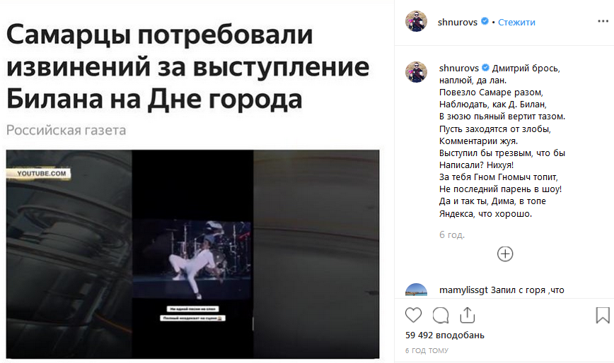 Но Сергей Шнуров не видит в этом ничего страшного и в в своем Intagram в стихах порассуждал о выступлении Димы Билана.
