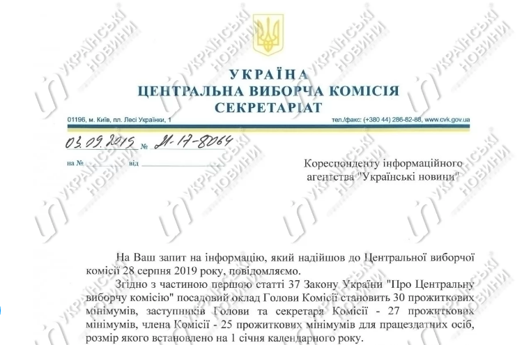 Зарплата членов Центральной избирательной комиссии Украины за август превысила выплаты за парламентские выборы и составила до 438 тысяч гривен. Об этом говорится в ответе секретариата ЦИКа на запрос Украинских новостей.