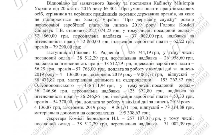 Зарплата остальных членов комиссии из не руководящего состава в августе была от 232,2 тысяч до 274,5 тысяч гривен.