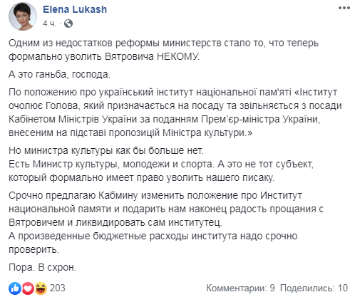 Лукаш предложила Кабмину изменить положение про Институт национальной памяти и "подарить нам наконец радость прощания с Вятровичем и ликвидировать сам институтец". Также она призвала срочно проверить произведенные бюджетные расходы этого заведения.