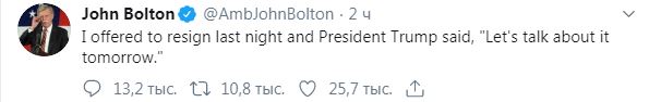 Советник президента США по нацбезопасности Джон Болтон во вторник заявил, что в беседе с Дональдом Трампом сам предложил подать в отставку. Об этом Болтон написал в Twitter.