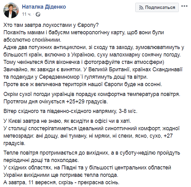 Как обещает Диденко, теплый воздух задержится в Украине до выходных, а в субботу и воскресенье пройдут дожди и похолодает. Хотя в восточном регионе, на юге и в большинстве центральных областей на выходных еще будет тепло.