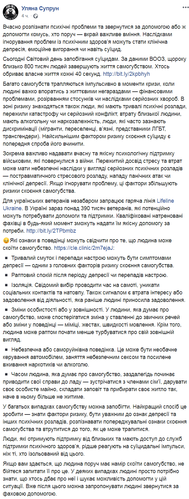 По случаю Всемирного дня предотвращения суицида, который отмечается 10 сентября, экс-глава Министерства здравоохранения Ульяна Супрун проинструктировала украинцев, как распознать потенциального самоубийцу. Этой теме она посвятила очередной пост на Facebook.