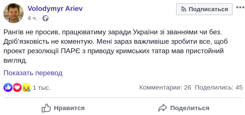 Владимир Арьев также заявил: "Ранга не просил, буду работать ради Украины со званиями или без. Мелочность не комментирую. Мне сейчас важнее сделать все, чтобы проект резолюции ПАСЕ по поводу крымских татар имел приличный вид". Об этом он сообщил на своей странице в Facebook.