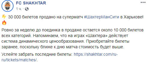 На первую домашнюю встречу "Шахтера" в новом сезоне Лиги Чемпионов против чемпиона Англии "Манчестер Сити" продано уже 30 000 билетов. Около 10 тысяч еще остается в продаже.