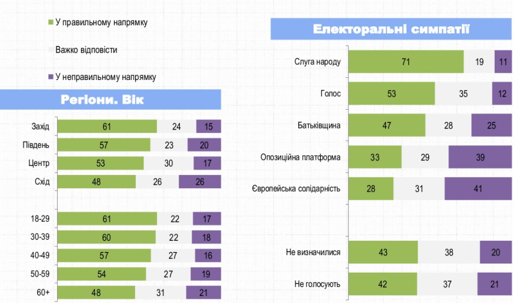 Лучше всего оценивают направление развития страны на западе и юге Украины, относительно хуже – в центре и на востоке. Более оптимистичной остается молодежь (18-29 лет) и избиратели "Слуги народа". Относительно больше пессимизма наблюдается среди старших и сторонников партий "Европейская Солидарность" и "Оппозиционная платформа - За жизнь".