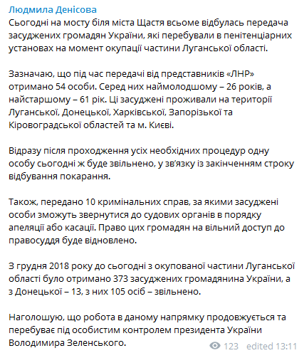 Денисова отмечает, что с декабря 2018 года до сегодня с неподконтрольной части Луганской области было получено 373 осужденных гражданина Украины, а с неподконтрольной части Донецкой - 13, из них 105 человек - освобождены.