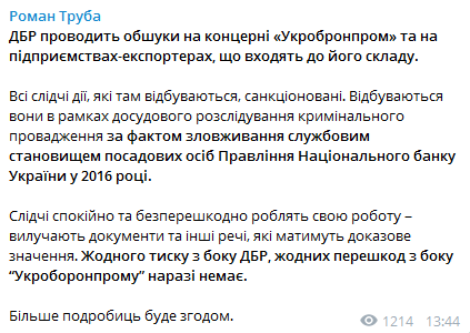 "Следователи спокойно и беспрепятственно делают свою работу - изымают документы и другие вещи, которые будут иметь доказательственное значение. Никакого давления со стороны ГБР, никаких препятствий со стороны "Укроборонпрома" пока нет", - написал Роман Труба.